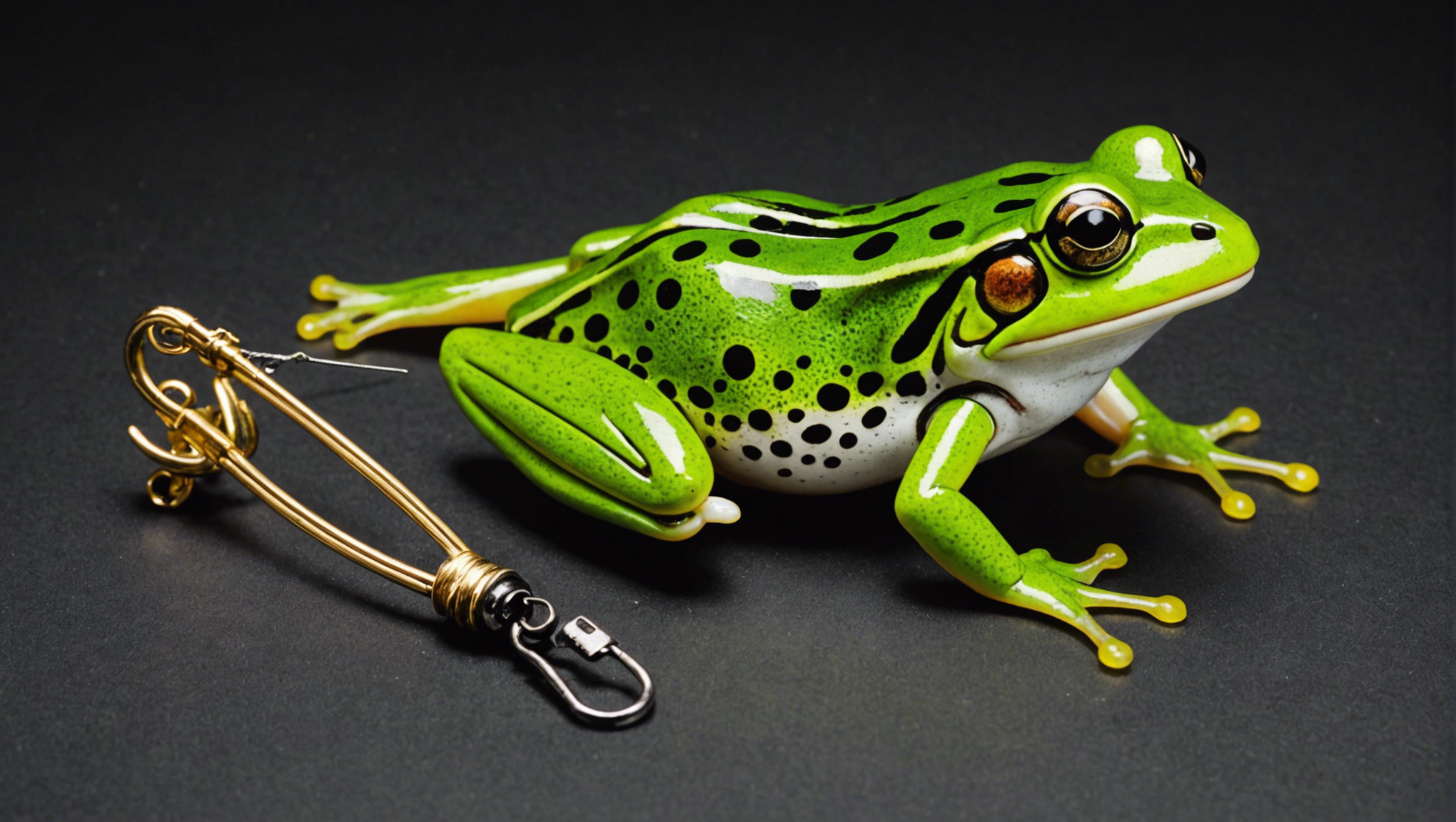 Stable Diffusion AI Prompt (((Green Frog))) fishing lure with treble hooks. A panoramic studio shot of the highly detailed fishing lure with treble hooks designed to catch fish, centered product lure photography. A masterpiece product photo on a (black background).