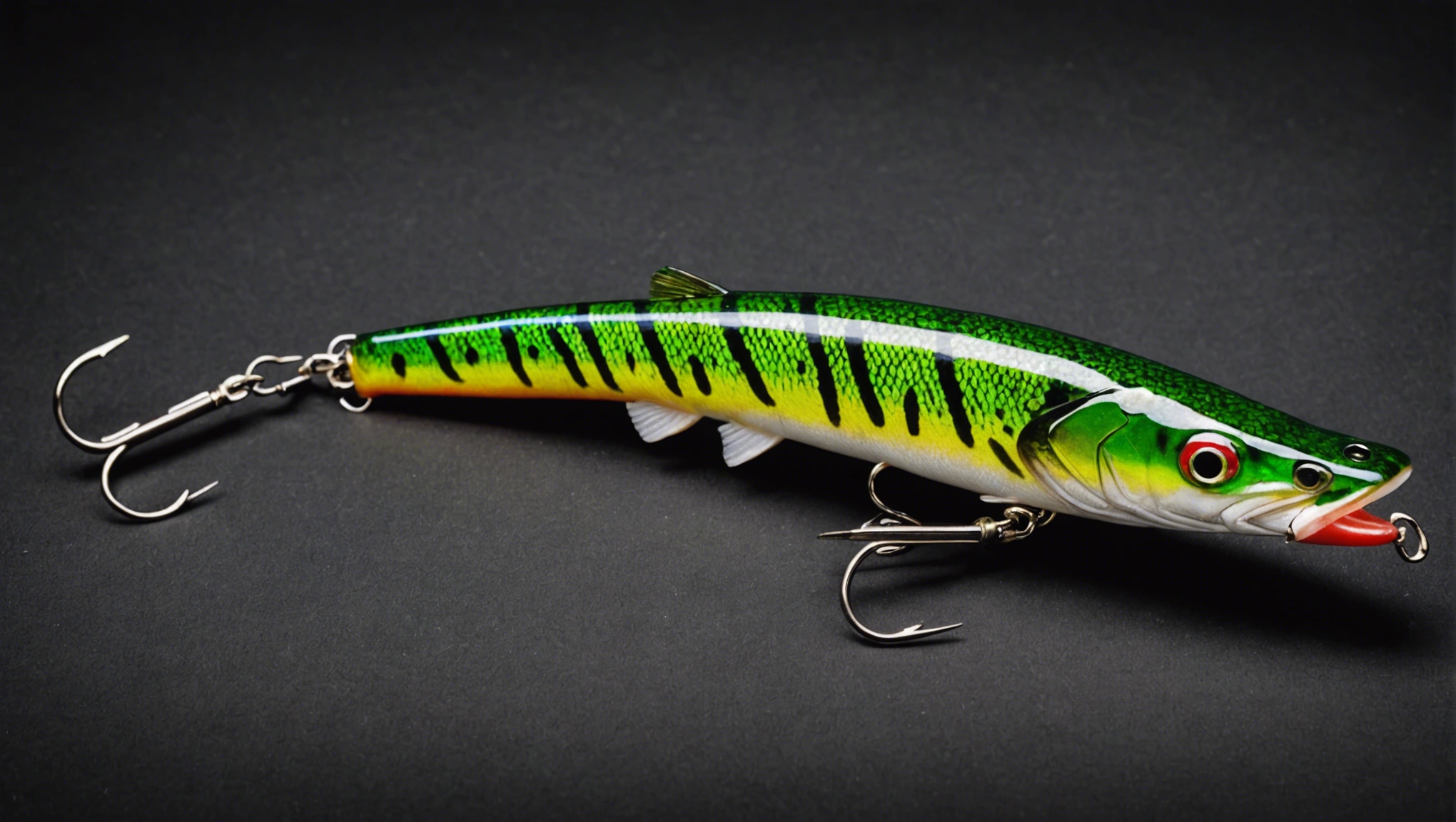 Fishing lure with fishing hooks like (((Green Pike))). A studio shot masterpiece lure product photo centered on a (black background).