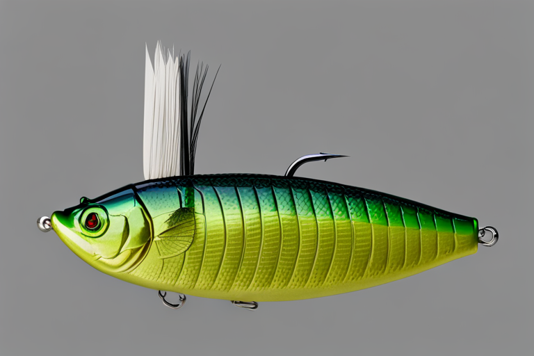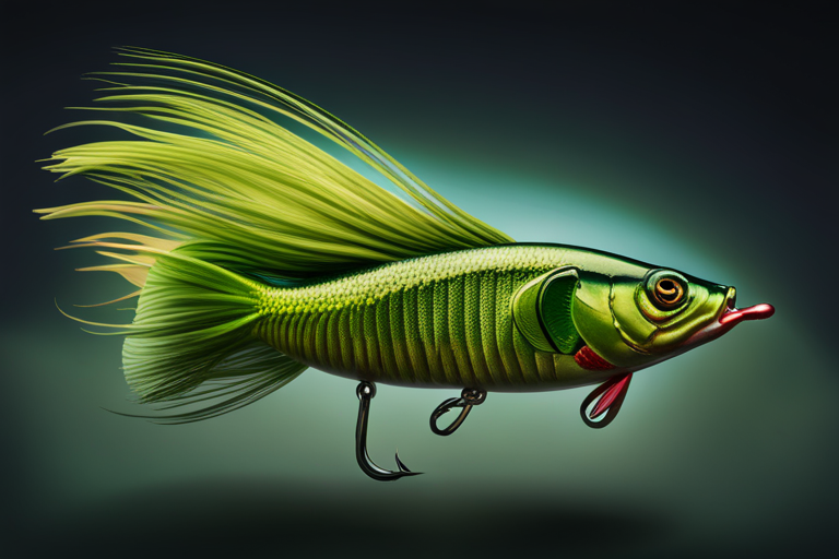 Stable Diffusion AI Prompt Fishing lure precisely mimics the exact shape and colors of a (((green pumpkin Bass))). A panoramic studio shot of the highly detailed green pumpkin colored ((Bass-shaped)) fishing lure with treble hooks designed to catch fish, centered product photography. A masterpiece product photo on a (black background).