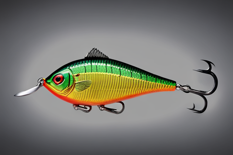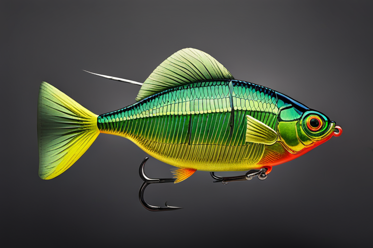 Stable Diffusion AI Prompt Fishing lure precisely mimics the exact shape and colors of a (((Green Sunfish))). A panoramic studio shot of the highly detailed Green colored ((Sunfish-shaped)) fishing lure with treble hooks designed to catch fish, centered product photography. A masterpiece product photo on a (black background).