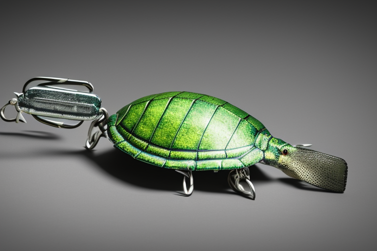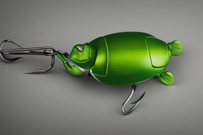 Stable Diffusion AI Prompt product photography of a fishing lure with hooks that looks like a Green colored Turtle!!!, (anatomically correct), futuristic, uhd, highly detailed, concept, product studio shot, panoramic shot, centered!!!, diffused lighting on a plain dark background, highly detailed, masterpiece, product photography by Wlop and Jovana Rikalo