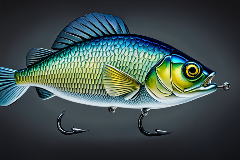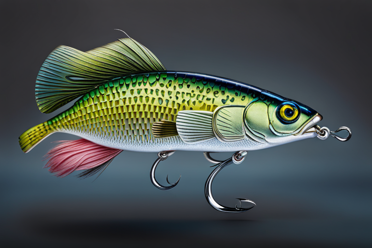 Stable Diffusion AI Prompt Fishing lure precisely mimics the exact shape and colors of a (((Indigo Crappie))). A panoramic studio shot of the highly detailed Indigo colored ((Crappie-shaped)) fishing lure with treble hooks designed to catch fish, centered product photography. A masterpiece product photo on a (black background).