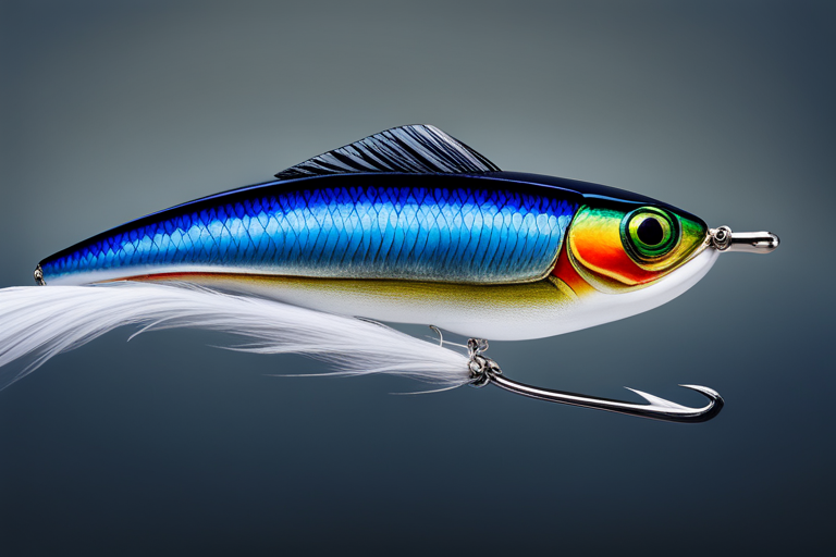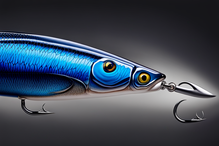 Stable Diffusion AI Prompt Fishing lure precisely mimics the exact shape and colors of a (((Indigo Minnow))). A panoramic studio shot of the highly detailed Indigo colored ((Minnow-shaped)) fishing lure with treble hooks designed to catch fish, centered product photography. A masterpiece product photo on a (black background).