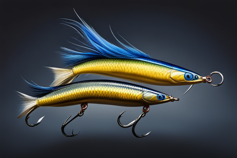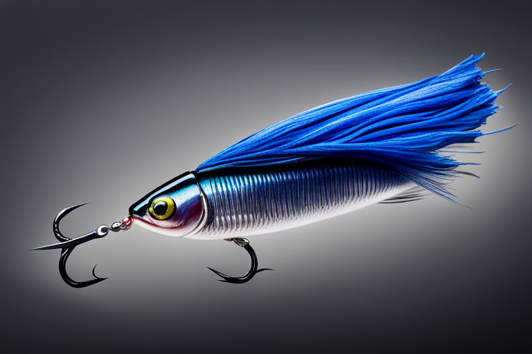 Stable Diffusion AI Prompt Fishing lure precisely mimics the exact shape and colors of a (((Indigo Minnow))). A panoramic studio shot of the highly detailed Indigo colored ((Minnow-shaped)) fishing lure with treble hooks designed to catch fish, centered product photography. A masterpiece product photo on a (black background).