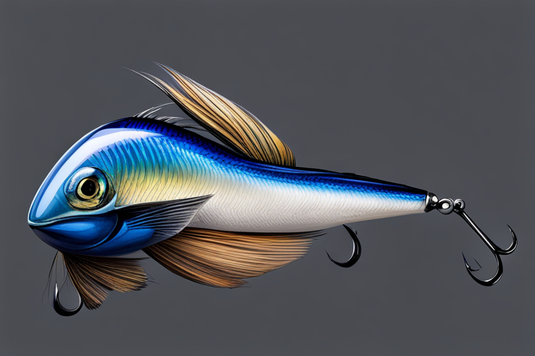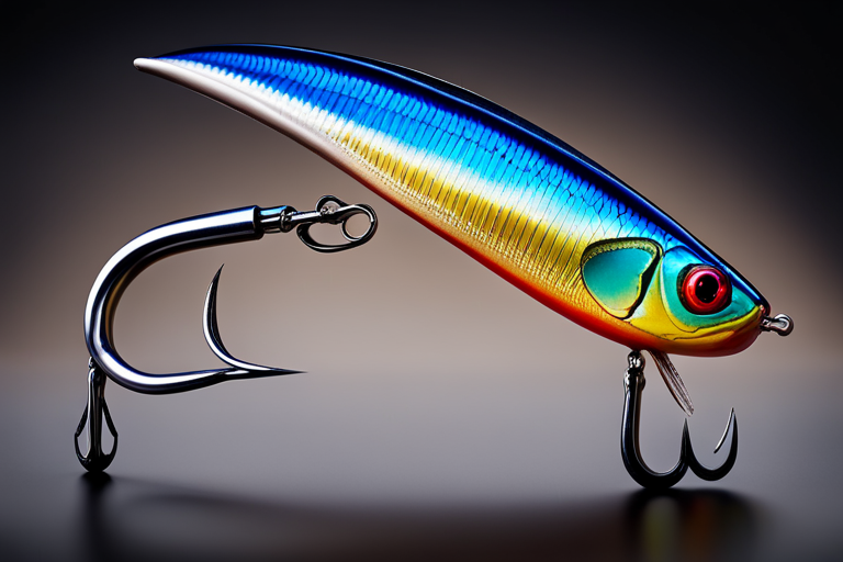 Stable Diffusion AI Prompt Fishing lure precisely mimics the exact shape and colors of a (((Indigo Minnow))). A panoramic studio shot of the highly detailed Indigo colored ((Minnow-shaped)) fishing lure with treble hooks designed to catch fish, centered product photography. A masterpiece product photo on a (black background).