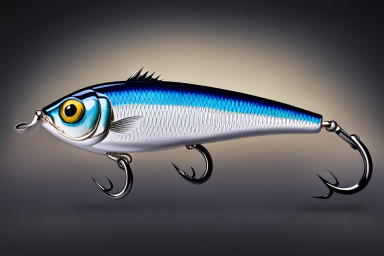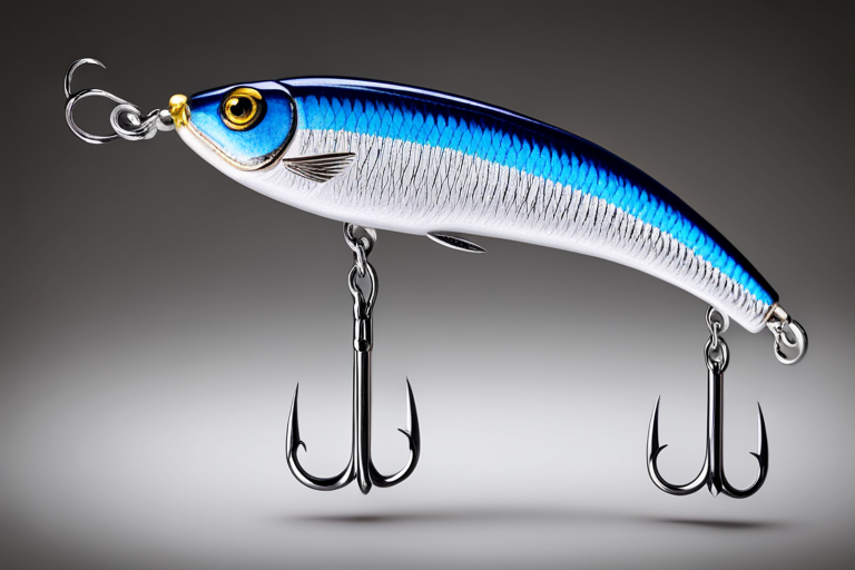 Stable Diffusion AI Prompt Fishing lure precisely mimics the exact shape and colors of a (((Indigo Minnow))). A panoramic studio shot of the highly detailed Indigo colored ((Minnow-shaped)) fishing lure with treble hooks designed to catch fish, centered product photography. A masterpiece product photo on a (black background).