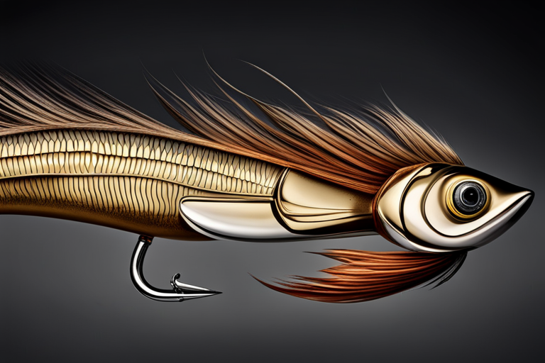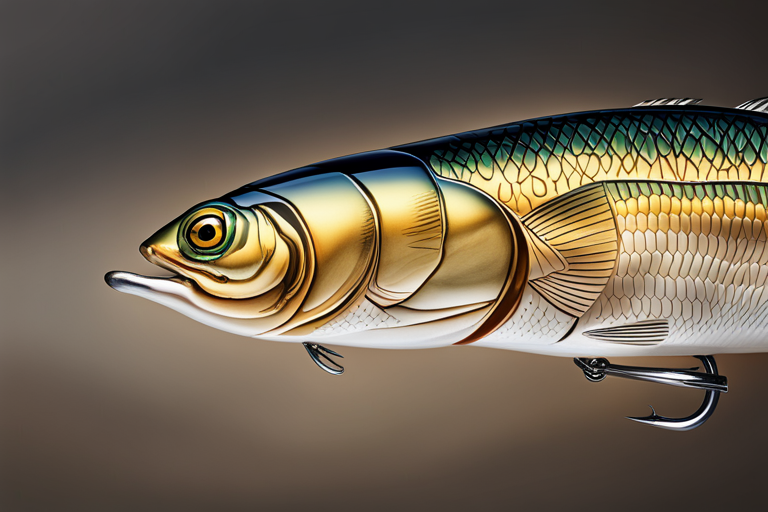 Stable Diffusion AI Prompt Fishing lure precisely mimics the exact shape and colors of a (((Light Brown Bass))). A panoramic studio shot of the highly detailed Light Brown colored ((Bass-shaped)) fishing lure with treble hooks designed to catch fish, centered product photography. A masterpiece product photo on a (black background).