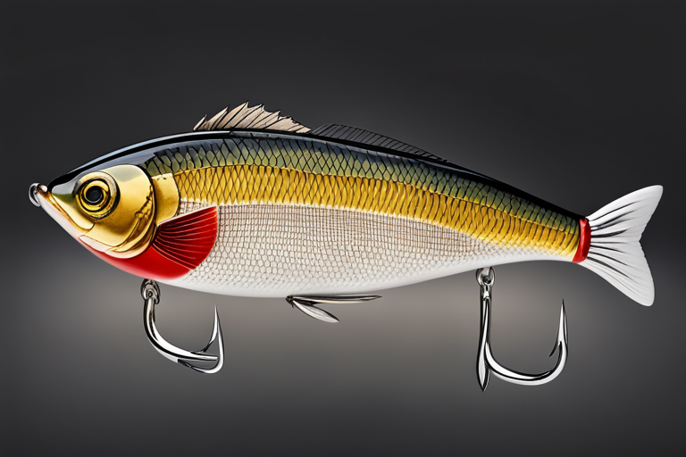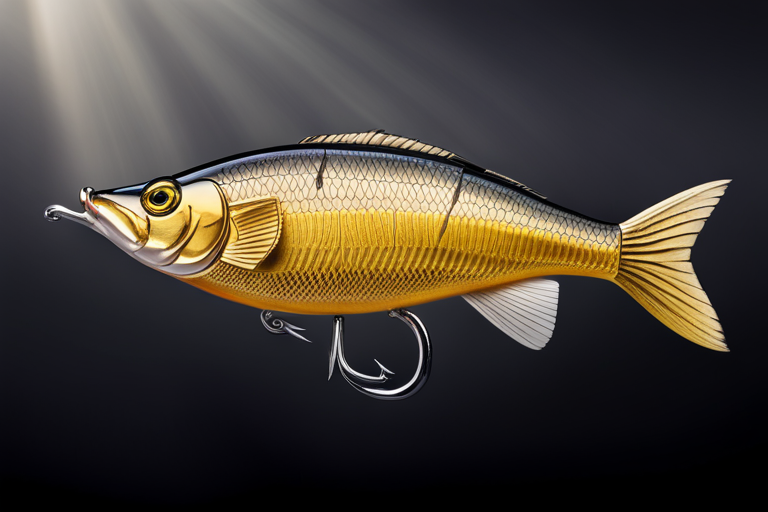 Stable Diffusion AI Prompt Fishing lure precisely mimics the exact shape and colors of a (((Light Brown Bass))). A panoramic studio shot of the highly detailed Light Brown colored ((Bass-shaped)) fishing lure with treble hooks designed to catch fish, centered product photography. A masterpiece product photo on a (black background).