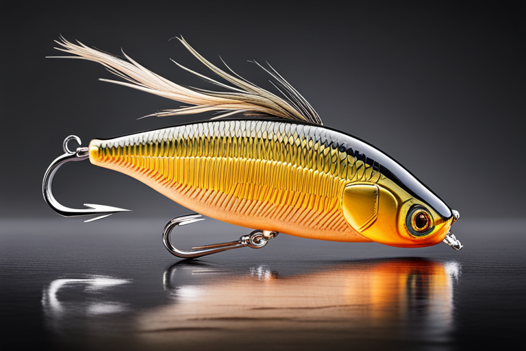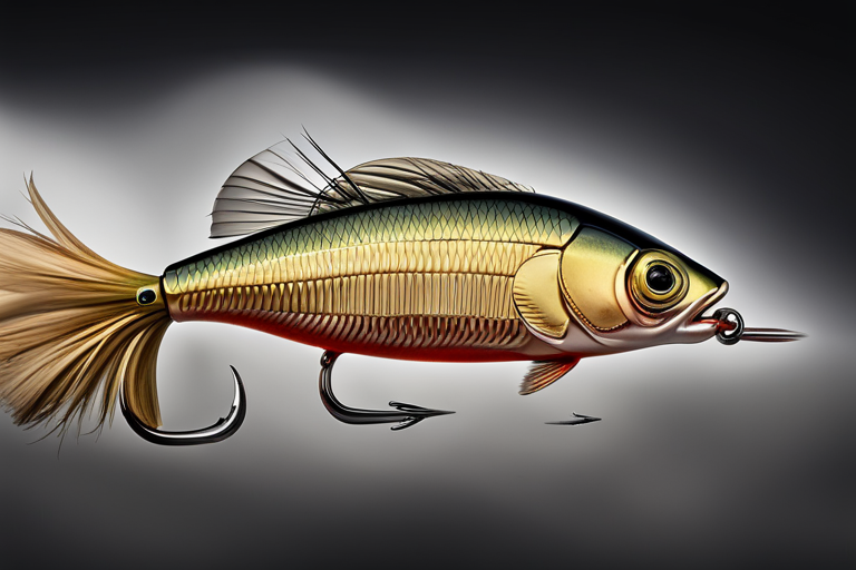 Stable Diffusion AI Prompt Fishing lure precisely mimics the exact shape and colors of a (((Light Brown Bass))). A panoramic studio shot of the highly detailed Light Brown colored ((Bass-shaped)) fishing lure with treble hooks designed to catch fish, centered product photography. A masterpiece product photo on a (black background).