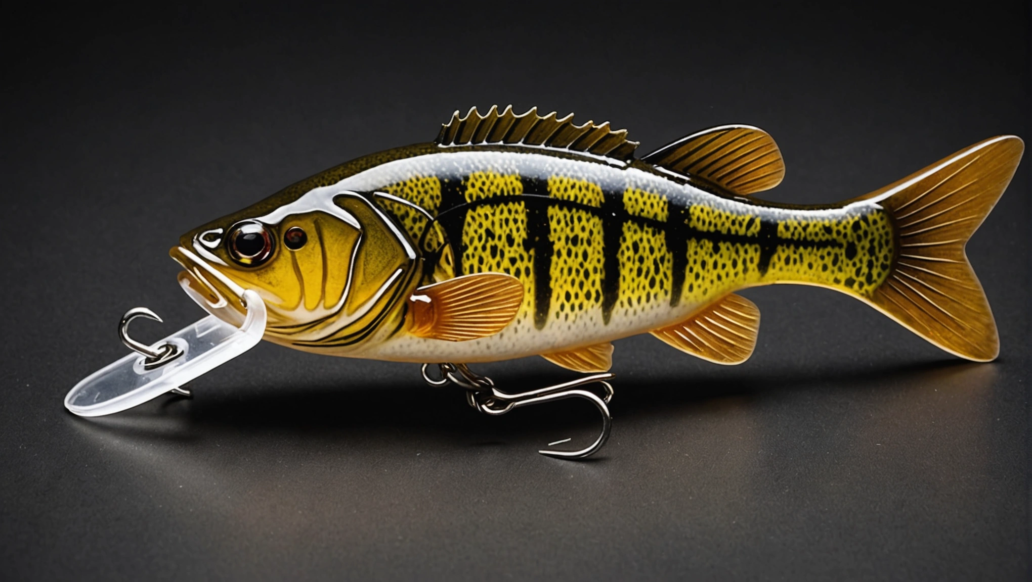 Fishing lure with fishing hooks like (((Light Brown Bass))). A studio shot masterpiece lure product photo centered on a (black background).