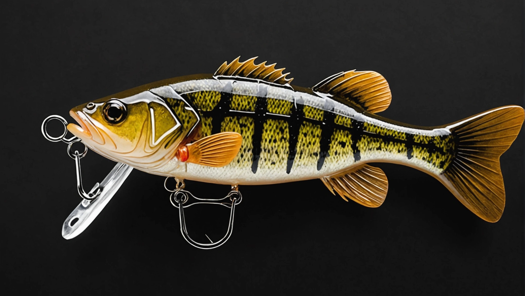 Fishing lure with fishing hooks like (((Light Brown Bass))). A studio shot masterpiece lure product photo centered on a (black background).