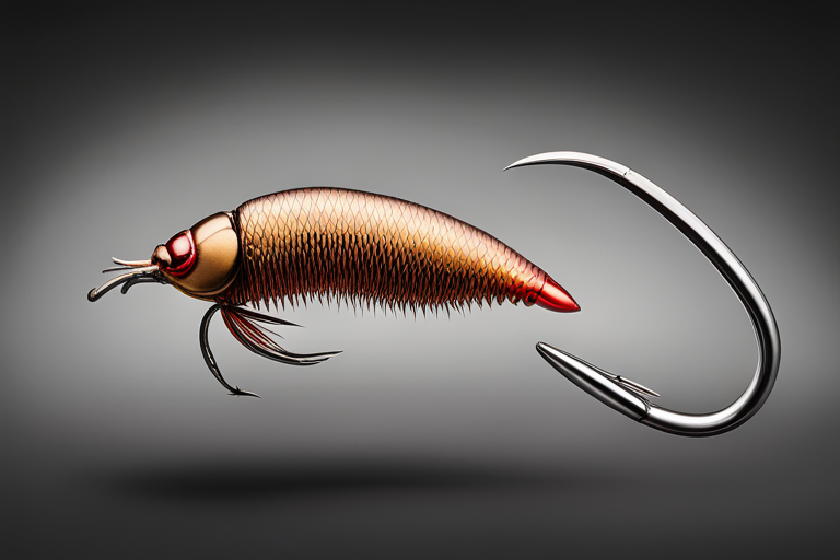 Stable Diffusion AI Prompt Fishing lure precisely mimics the exact shape and colors of a (((Light Brown Beetle))). A panoramic studio shot of the highly detailed Light Brown colored ((Beetle-shaped)) fishing lure with treble hooks designed to catch fish, centered product photography. A masterpiece product photo on a (black background).