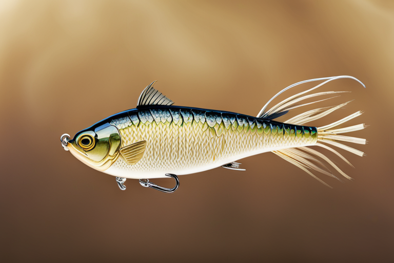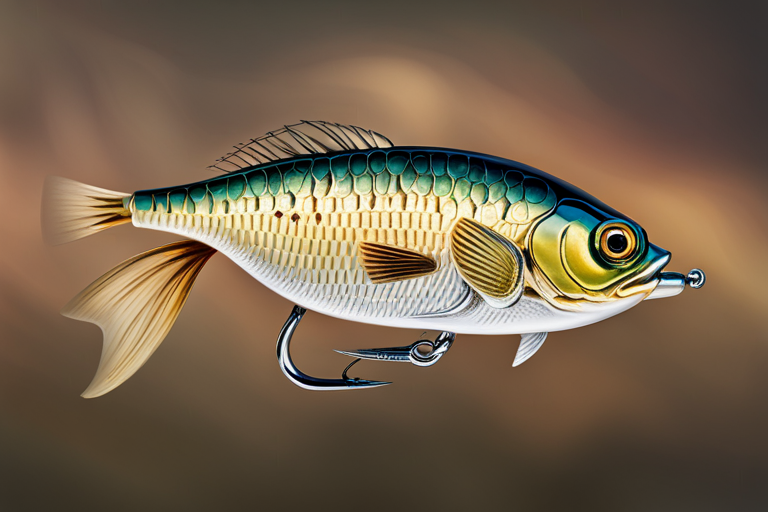 Stable Diffusion AI Prompt Fishing lure precisely mimics the exact shape and colors of a (((Light Brown Crappie))). A panoramic studio shot of the highly detailed conceptual ((Crappie-shaped)) fishing lure designed to catch fish, centered product photography. It has treble hooks and is Light Brown in color. A masterpiece product photo on plain dark background by photographer Jovana Rikalo.