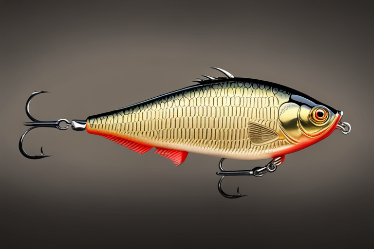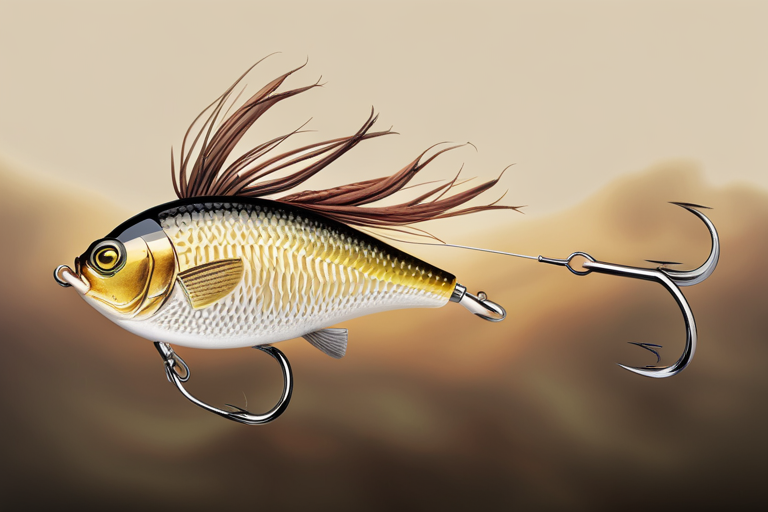 Stable Diffusion AI Prompt Fishing lure precisely mimics the exact shape and colors of a (((Light Brown Crappie))). A panoramic studio shot of the highly detailed Light Brown colored ((Crappie-shaped)) fishing lure with treble hooks designed to catch fish, centered product photography. A masterpiece product photo on a (black background).