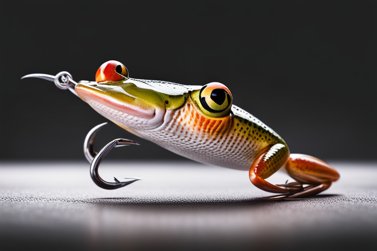Stable Diffusion AI Prompt Fishing lure precisely mimics the exact shape and colors of a (((Light Brown Frog))). A panoramic studio shot of the highly detailed Light Brown colored ((Frog-shaped)) fishing lure with treble hooks designed to catch fish, centered product photography. A masterpiece product photo on a (black background).