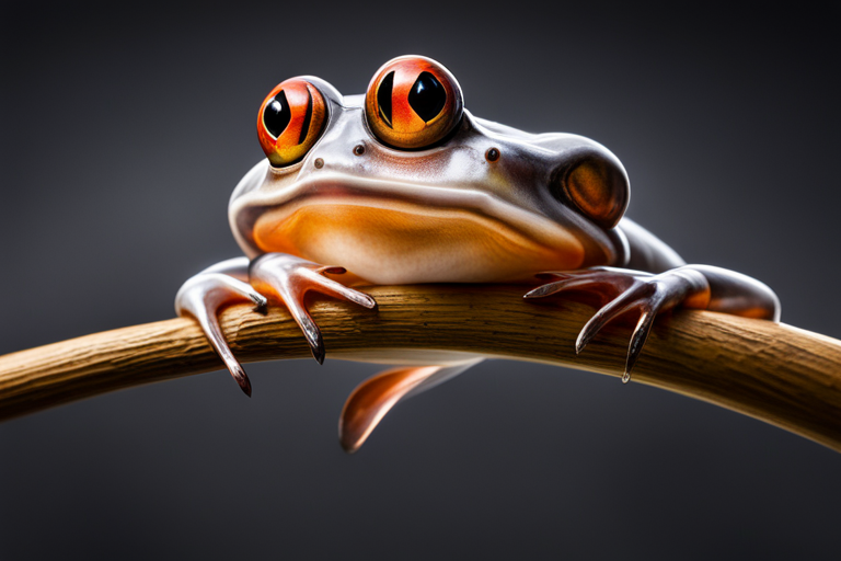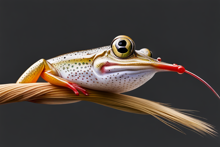 Stable Diffusion AI Prompt Fishing lure precisely mimics the exact shape and colors of a (((Light Brown Frog))). A panoramic studio shot of the highly detailed Light Brown colored ((Frog-shaped)) fishing lure with treble hooks designed to catch fish, centered product photography. A masterpiece product photo on a (black background).