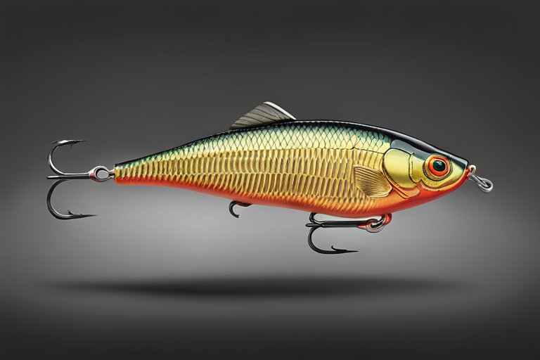Stable Diffusion AI Prompt Fishing lure precisely mimics the exact shape and colors of a (((Light Brown Perch))). A panoramic studio shot of the highly detailed Light Brown colored ((Perch-shaped)) fishing lure with treble hooks designed to catch fish, centered product photography. A masterpiece product photo on a (black background).