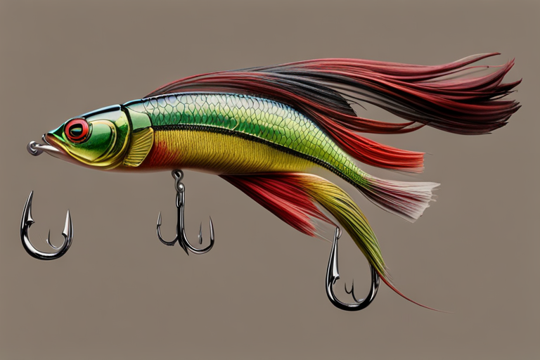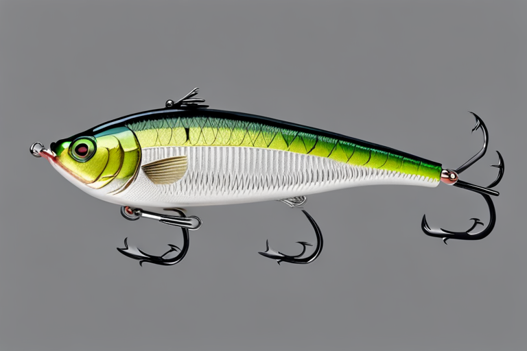 Stable Diffusion AI Prompt Fishing lure precisely mimics the exact shape and colors of a (((Natural Bass))). A panoramic studio shot of the highly detailed Natural colored ((Bass-shaped)) fishing lure with treble hooks designed to catch fish, centered product photography. A masterpiece product photo on a (black background).