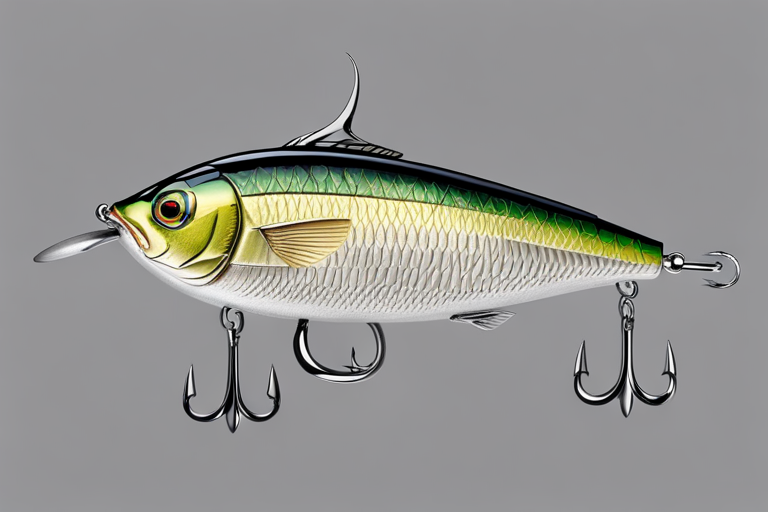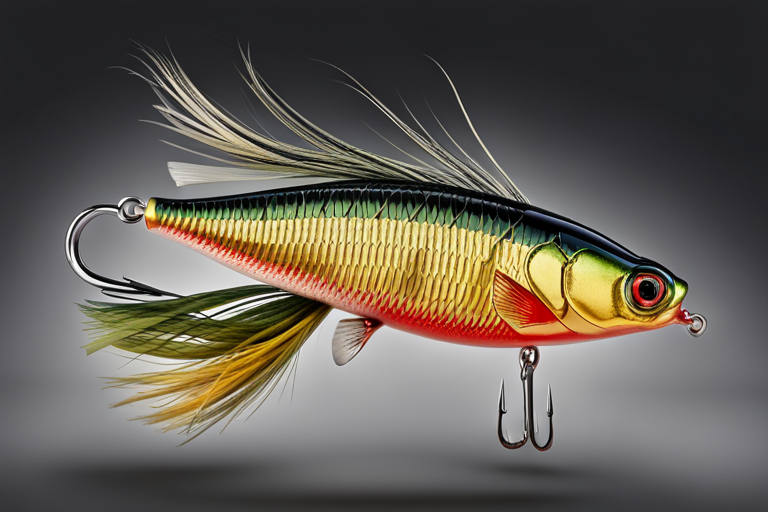 Stable Diffusion AI Prompt Fishing lure precisely mimics the exact shape and colors of a (((Natural Bass))). A panoramic studio shot of the highly detailed Natural colored ((Bass-shaped)) fishing lure with treble hooks designed to catch fish, centered product photography. A masterpiece product photo on a (black background).