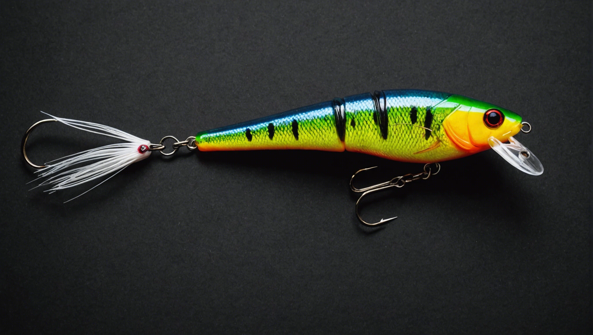 Fishing lure with fishing hooks like (((Natural bull gill swim bait))). A studio shot masterpiece lure product photo centered on a (black background).