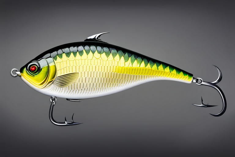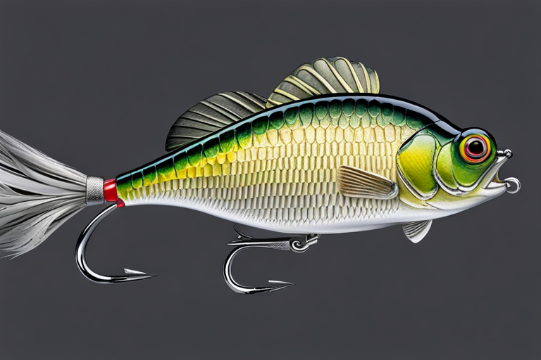 Stable Diffusion AI Prompt Fishing lure precisely mimics the exact shape and colors of a (((Natural Crappie))). A panoramic studio shot of the highly detailed Natural colored ((Crappie-shaped)) fishing lure with treble hooks designed to catch fish, centered product photography. A masterpiece product photo on a (black background).