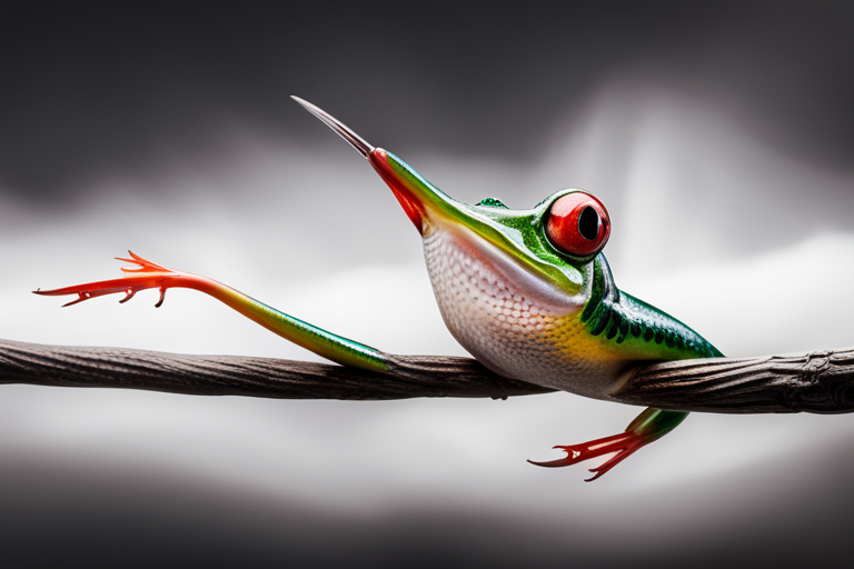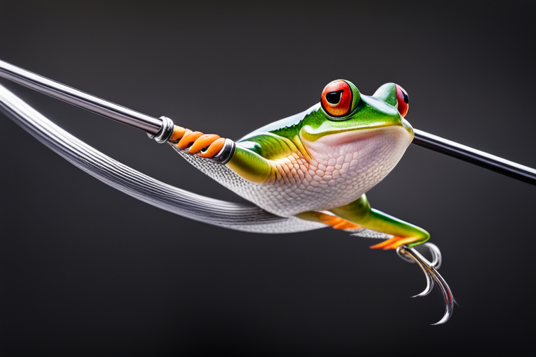 Stable Diffusion AI Prompt Fishing lure precisely mimics the exact shape and colors of a (((Natural Frog))). A panoramic studio shot of the highly detailed Natural colored ((Frog-shaped)) fishing lure with treble hooks designed to catch fish, centered product photography. A masterpiece product photo on a (black background).