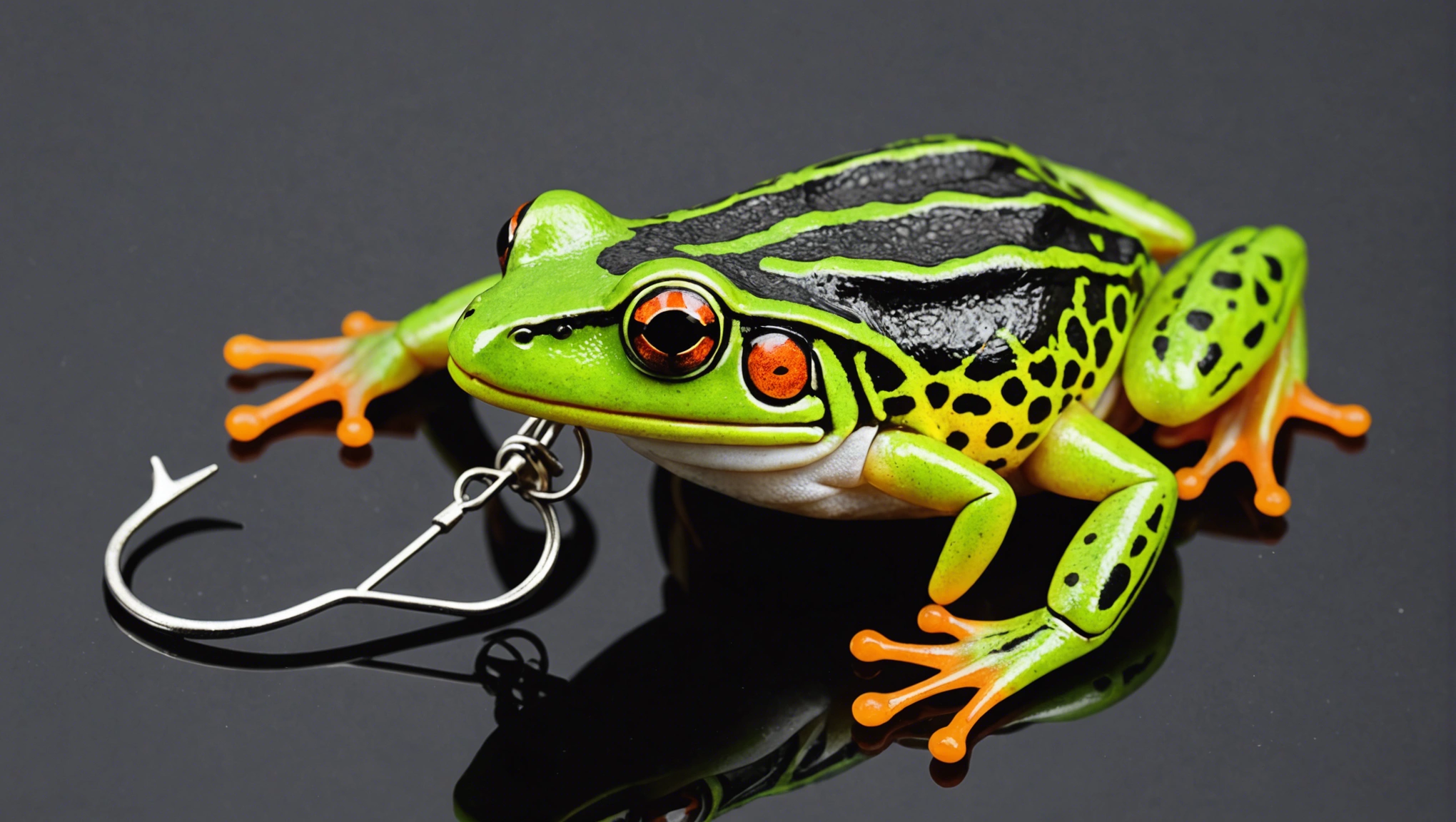 Fishing lure with fishing hooks like (((Natural Frog))). A studio shot masterpiece lure product photo centered on a (black background).