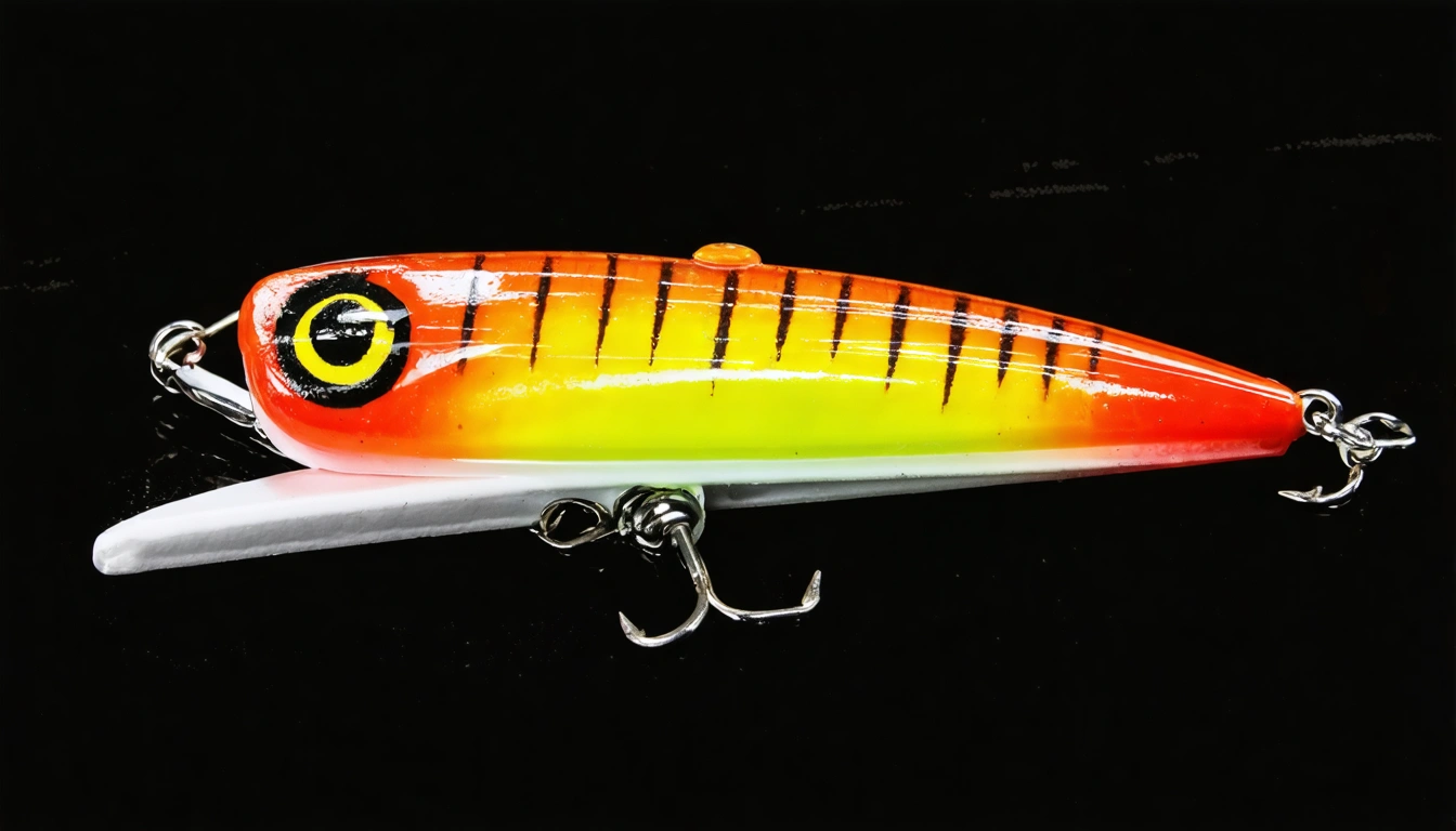 Fishing lure with fishing hooks like (((Natural KFC chicken bucket))). A studio shot masterpiece lure product photo centered on a (black background).