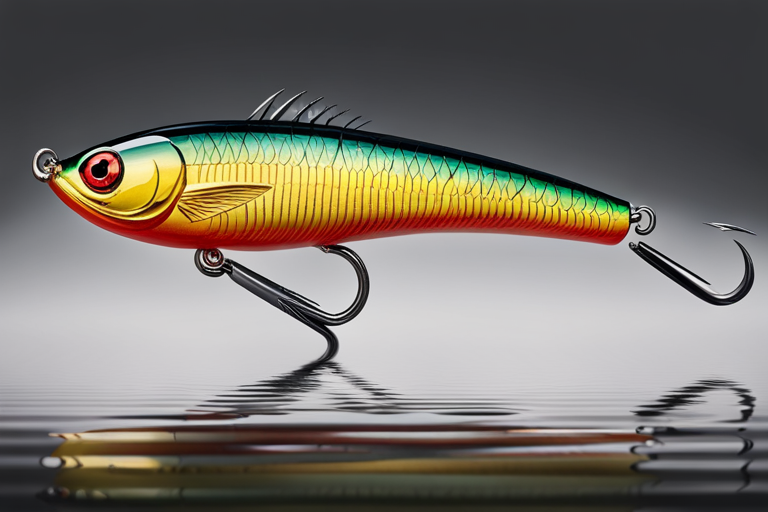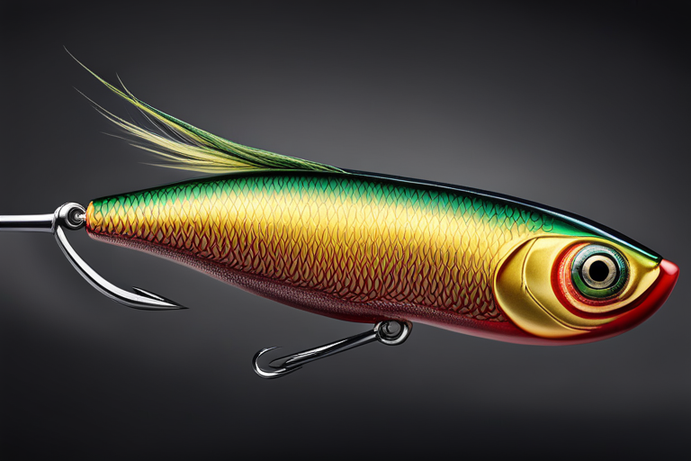 Stable Diffusion AI Prompt Fishing lure precisely mimics the exact shape and colors of a (((Natural Minnow))). A panoramic studio shot of the highly detailed Natural colored ((Minnow-shaped)) fishing lure with treble hooks designed to catch fish, centered product photography. A masterpiece product photo on a (black background).