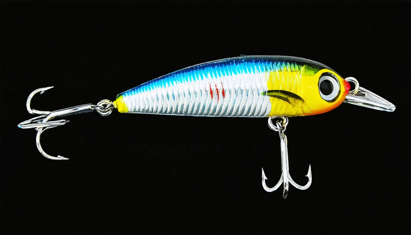 Fishing lure with fishing hooks like (((Natural Minnow))). A studio shot masterpiece lure product photo centered on a (black background).