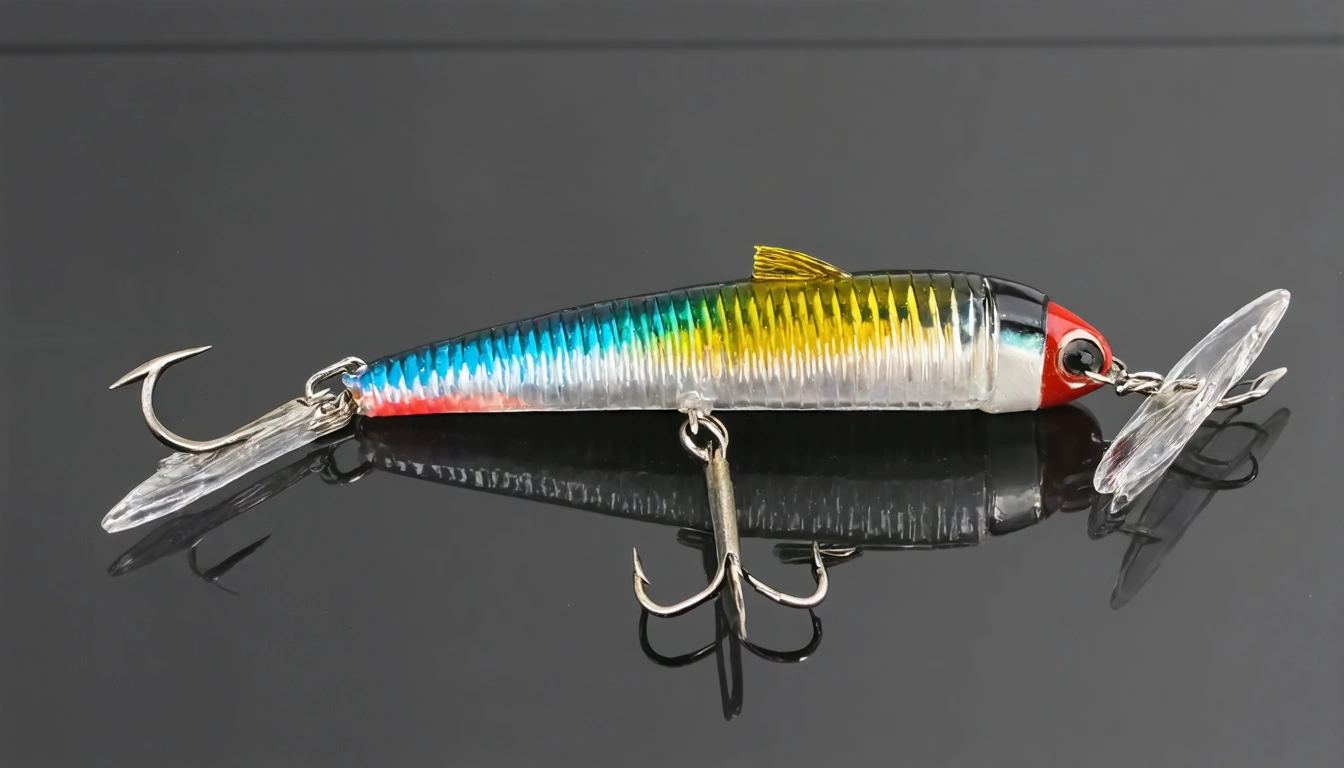 Fishing lure with fishing hooks like (((Natural Minnow))). A studio shot masterpiece lure product photo centered on a (black background).