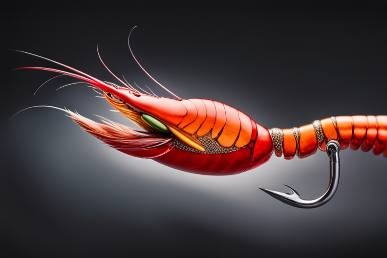 Stable Diffusion AI Prompt Fishing lure precisely mimics the exact shape and colors of a (((Natural Prawn))). A panoramic studio shot of the highly detailed Natural colored ((Prawn-shaped)) fishing lure with treble hooks designed to catch fish, centered product photography. A masterpiece product photo on a (black background).