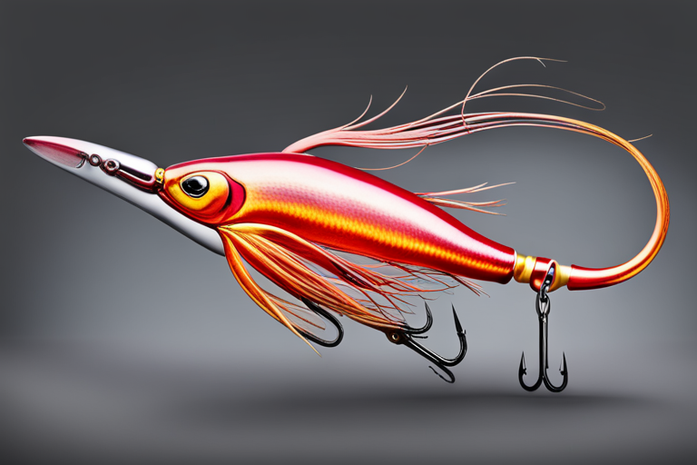 Stable Diffusion AI Prompt Fishing lure precisely mimics the exact shape and colors of a (((Natural Squid))). A panoramic studio shot of the highly detailed Natural colored ((Squid-shaped)) fishing lure with treble hooks designed to catch fish, centered product photography. A masterpiece product photo on a (black background).