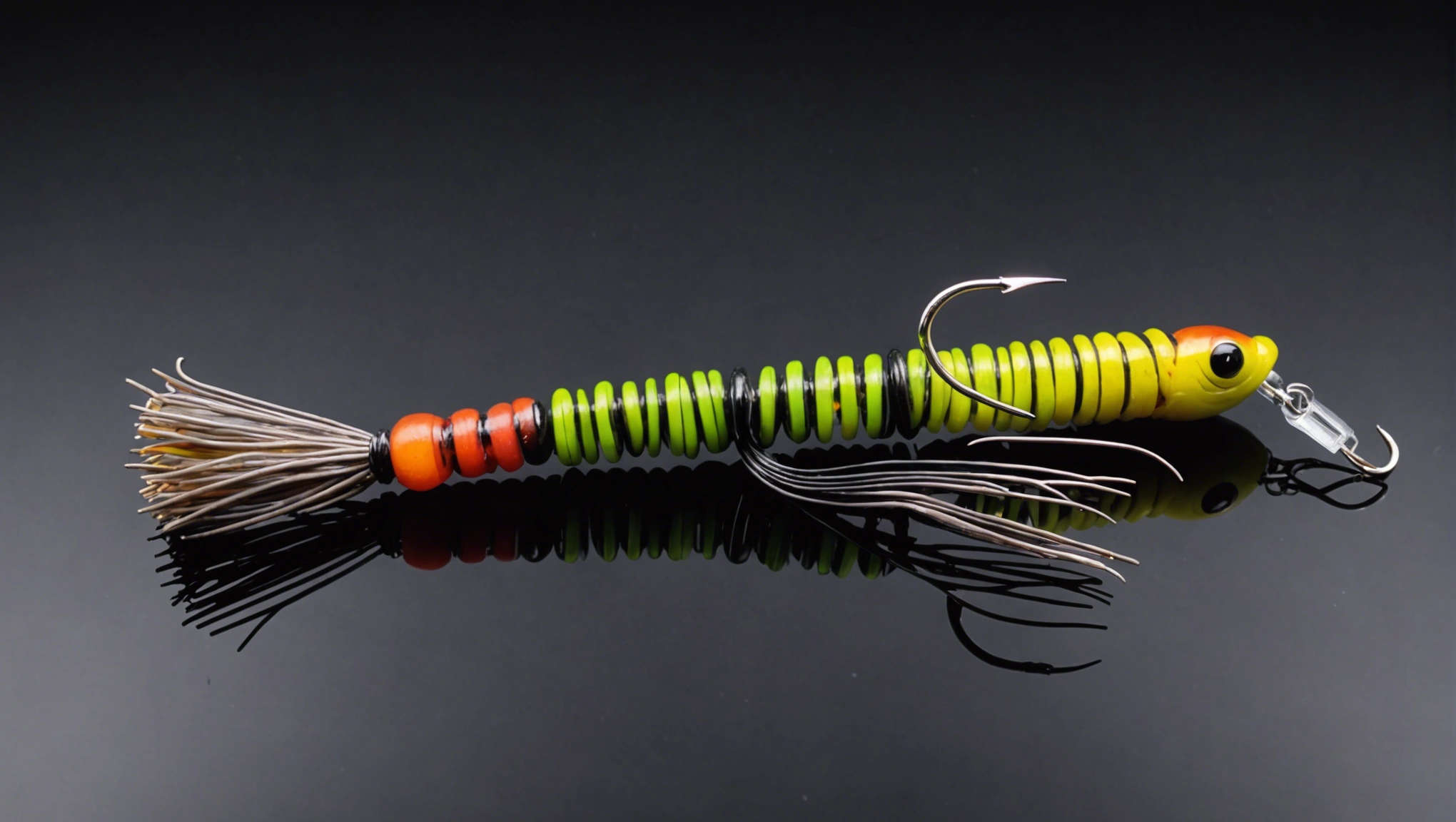 Fishing lure with fishing hooks like (((Natural wacky worm with a jig head))). A studio shot masterpiece lure product photo centered on a (black background).