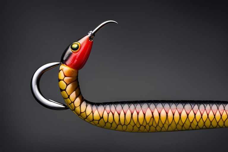 Stable Diffusion AI Prompt panoramic shot!!!, centered!!! Natural colored Worm!!! fishing lure with treble hooks, uhd, highly detailed, concept, product studio shot, diffused lighting on a plain dark background, masterpiece, product photography by Jovana Rikalo