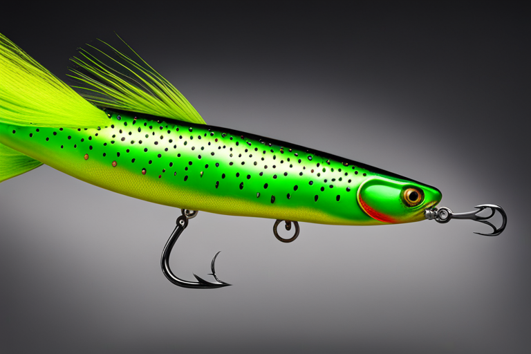 Stable Diffusion AI Prompt Fishing lure precisely mimics the exact shape and colors of a (((neon lime green Trout))). A panoramic studio shot of the highly detailed neon lime green colored ((Trout-shaped)) fishing lure with treble hooks designed to catch fish, centered product photography. A masterpiece product photo on a (black background).