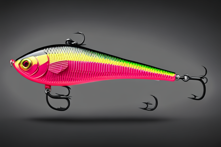 Stable Diffusion AI Prompt Fishing lure precisely mimics the exact shape and colors of a (((neon pink Perch))). A panoramic studio shot of the highly detailed neon pink colored ((Perch-shaped)) fishing lure with treble hooks designed to catch fish, centered product photography. A masterpiece product photo on a (black background).