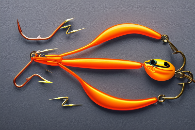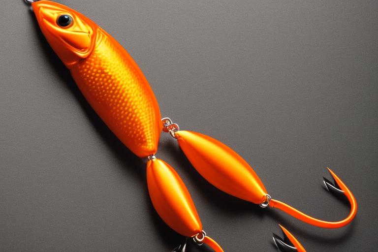 Stable Diffusion AI Prompt product photography of a fishing lure with hooks that looks like a Orange colored Bass!!!, (anatomically correct), futuristic, uhd, highly detailed, concept, product studio shot, panoramic shot, centered!!!, diffused lighting on a plain dark background, highly detailed, masterpiece, product photography by Wlop and Jovana Rikalo