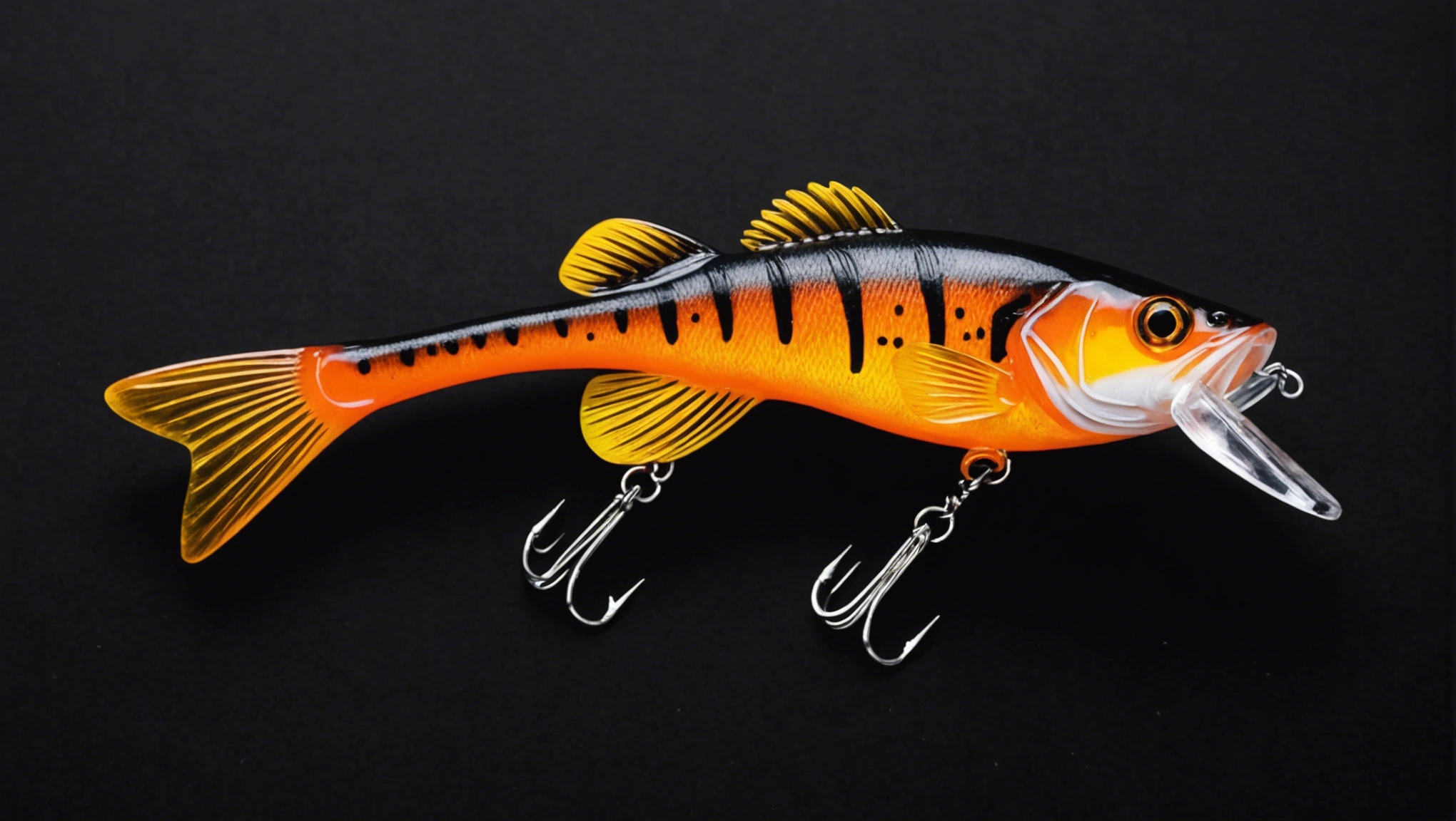 Fishing lure with fishing hooks like (((Orange Bass))). A studio shot masterpiece lure product photo centered on a (black background).