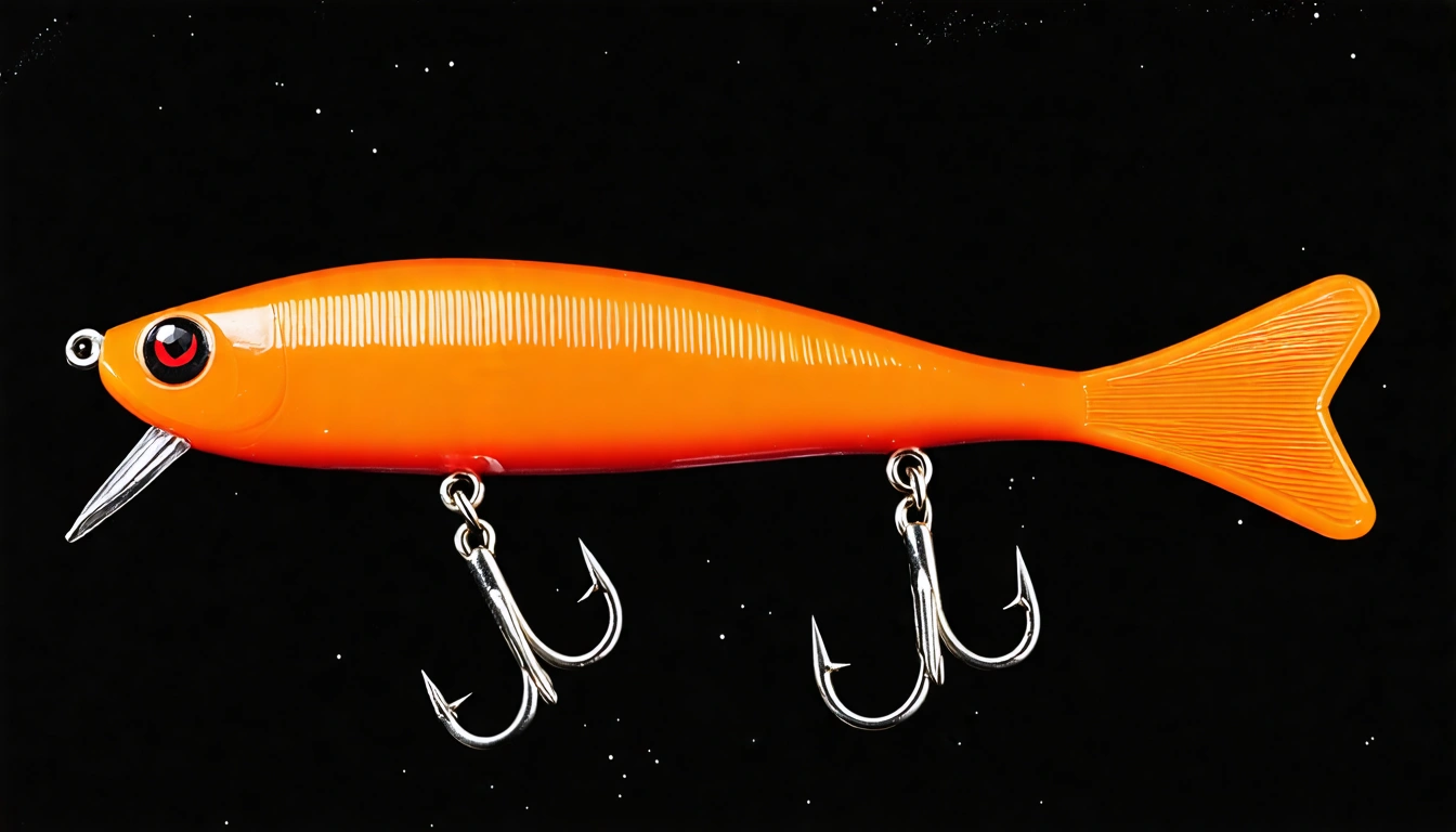 Fishing lure with fishing hooks like (((Orange Bass))). A studio shot masterpiece lure product photo centered on a (black background).