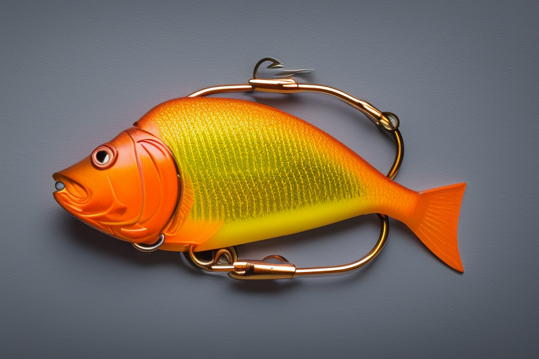 Stable Diffusion AI Prompt product photography of a fishing lure with hooks that looks like a Orange colored Bluegill!!!, (anatomically correct), futuristic, uhd, highly detailed, concept, product studio shot, panoramic shot, centered!!!, diffused lighting on a plain dark background, highly detailed, masterpiece, product photography by Wlop and Jovana Rikalo