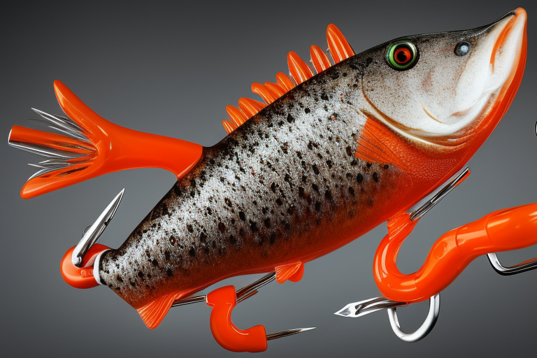 Stable Diffusion AI Prompt product photography of a fishing lure with hooks that looks like a Orange colored Crappie!!!, (anatomically correct), futuristic, uhd, highly detailed, concept, product studio shot, panoramic shot, centered!!!, diffused lighting on a plain dark background, highly detailed, masterpiece, product photography by Wlop and Jovana Rikalo