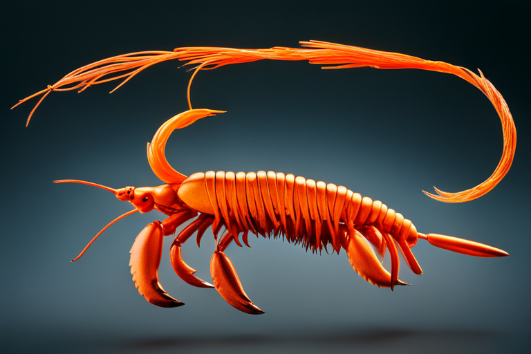 Stable Diffusion AI Prompt Fishing lure precisely mimics the exact shape and colors of a (((Orange Crawfish))). A panoramic studio shot of the highly detailed Orange colored ((Crawfish-shaped)) fishing lure with treble hooks designed to catch fish, centered product photography. A masterpiece product photo on a (black background).