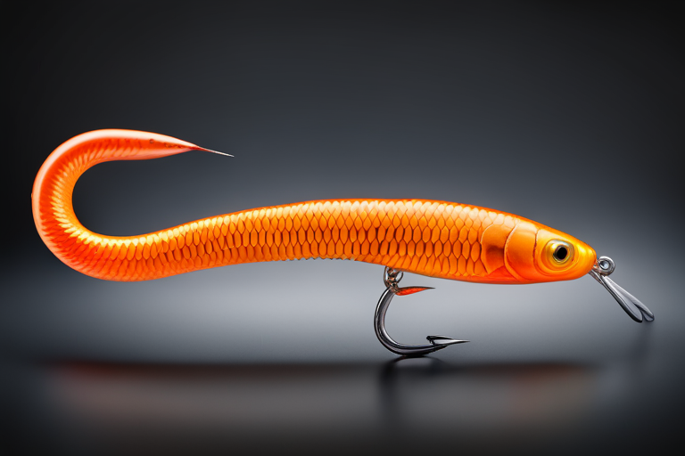 Stable Diffusion AI Prompt Fishing lure precisely mimics the exact shape and colors of a (((Orange Earthworm))). A panoramic studio shot of the highly detailed Orange colored ((Earthworm-shaped)) fishing lure with treble hooks designed to catch fish, centered product photography. A masterpiece product photo on a (black background).