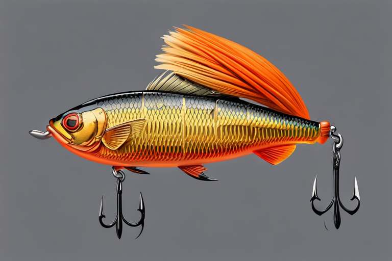 Stable Diffusion AI Prompt Fishing lure precisely mimics the exact shape and colors of a (((Orange Perch))). A panoramic studio shot of the highly detailed Orange colored ((Perch-shaped)) fishing lure with treble hooks designed to catch fish, centered product photography. A masterpiece product photo on a (black background).