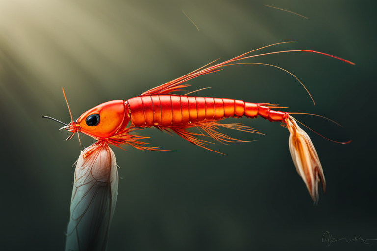 Stable Diffusion AI Prompt panoramic shot!!!, centered!!! Orange colored Prawn!!! fishing lure, uhd, highly detailed, concept, product studio shot, diffused lighting on a plain dark background, masterpiece, product photography by Jovana Rikalo