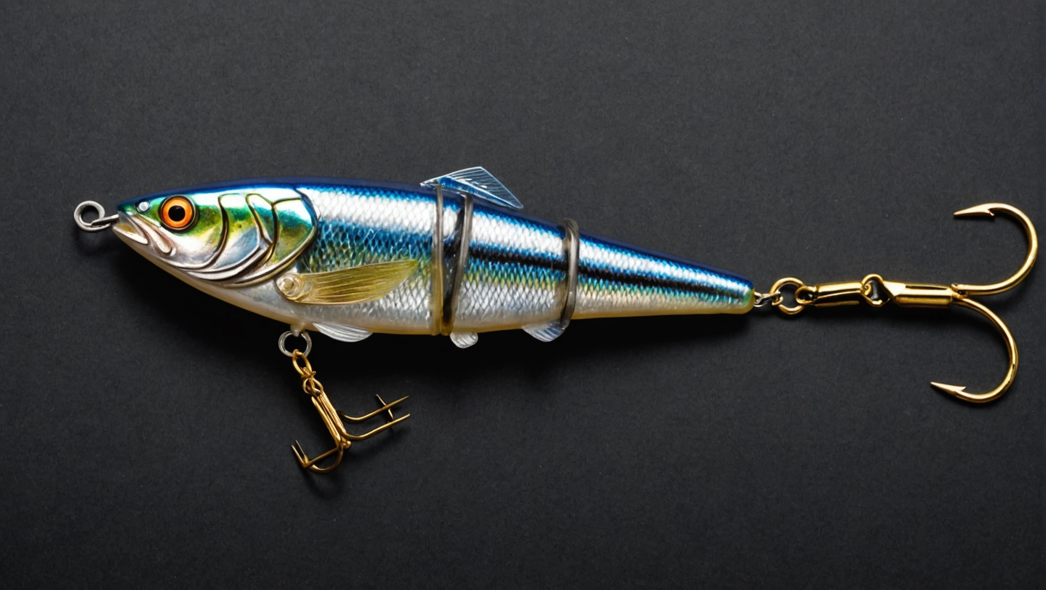 Fishing lure with fishing hooks like (((Orange Shad))). A studio shot masterpiece lure product photo centered on a (black background).
