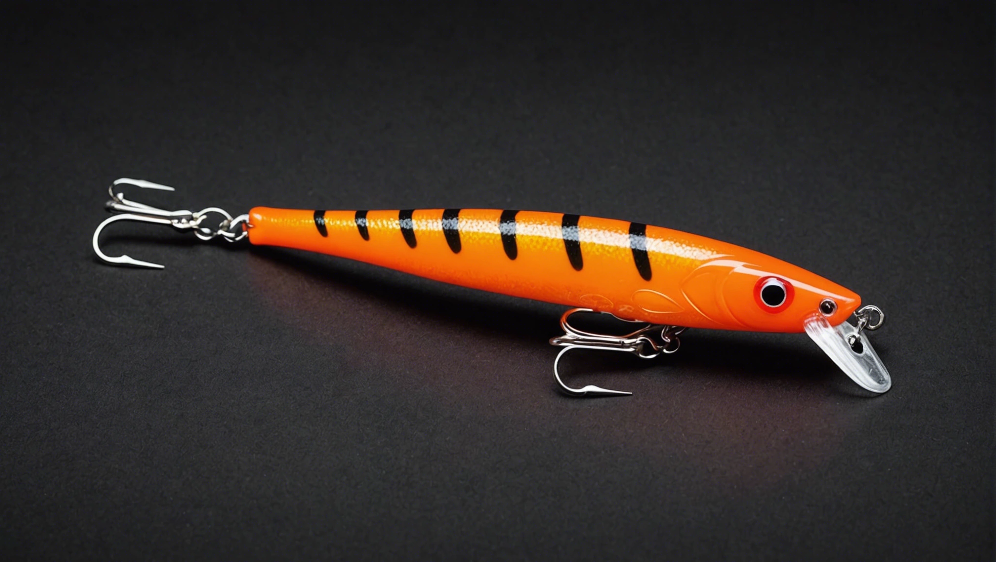 Fishing lure with fishing hooks like (((Orange Slim jerkbait that looks moders))). A studio shot masterpiece lure product photo centered on a (black background).
