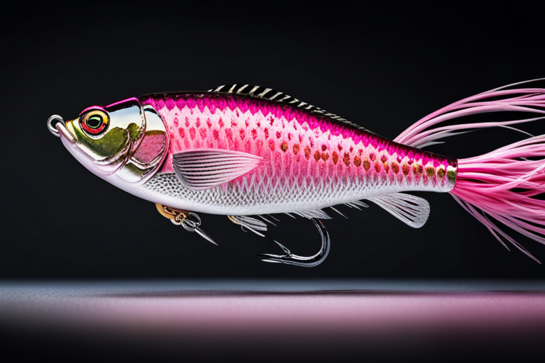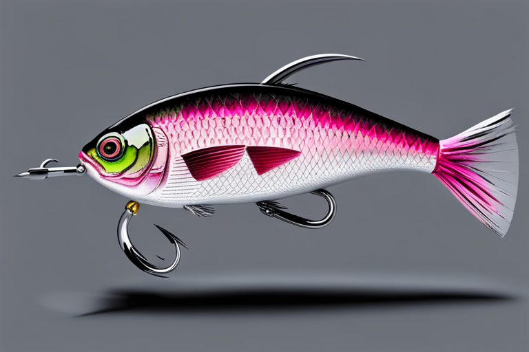 Stable Diffusion AI Prompt Fishing lure precisely mimics the exact shape and colors of a (((Pink Crappie))). A panoramic studio shot of the highly detailed Pink colored ((Crappie-shaped)) fishing lure with treble hooks designed to catch fish, centered product photography. A masterpiece product photo on a (black background).