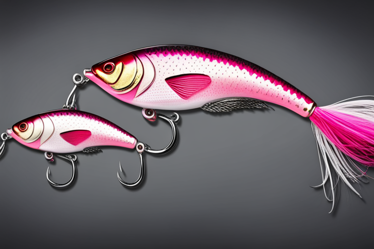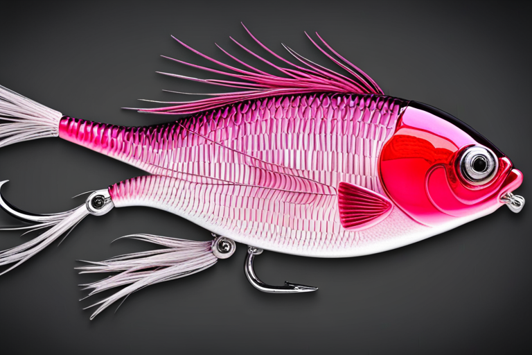 Stable Diffusion AI Prompt Fishing lure precisely mimics the exact shape and colors of a (((Pink Crappie))). A panoramic studio shot of the highly detailed Pink colored ((Crappie-shaped)) fishing lure with treble hooks designed to catch fish, centered product photography. A masterpiece product photo on a (black background).